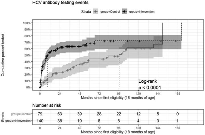 Background Perinatal exposure to hepatitis C virus (HCV) is a major public health issue, and poor testing rates leave many children with infection unidentified. We sought to use the electronic health record (EHR) to promote guideline-directed HCV testing among infants born to mothers with HCV infection in an urban, safety-net hospital system. Methods Our study population was identified using our EHR database, Epic. Children were included in the study if they had perinatal HCV exposure, were 18 months to 18 years of age and had at least 1 encounter in a primary or urgent care clinic during the study period. Our study included retrospective (October 2011 to February 2015) and prospective (February 2015 to May 2018) arms. Our EHR-based intervention was initiated in the prospective arm and recommended a one-time HCV antibody test at or after the age of 18 months using a health maintenance reminder. The health maintenance reminder activated a point-of-care alert and a linked HCV testing order set in all prespecified encounters during the intervention period. Results Median time to appropriate HCV testing decreased from 96.2 months preintervention to 9.1 months postintervention (P < 0.0001), and rate of completed antibody testing increased from 14% to 61% (P < 0.0001). Conclusions Among children with perinatal HCV exposure, using a point-of-care alert within the EHR significantly increased the HCV antibody testing rate in accordance with American Academy of Pediatrics (AAP) recommendations. More effective EHR-based interventions combined with increased provider awareness of appropriate HCV testing in perinatally exposed infants is imperative.